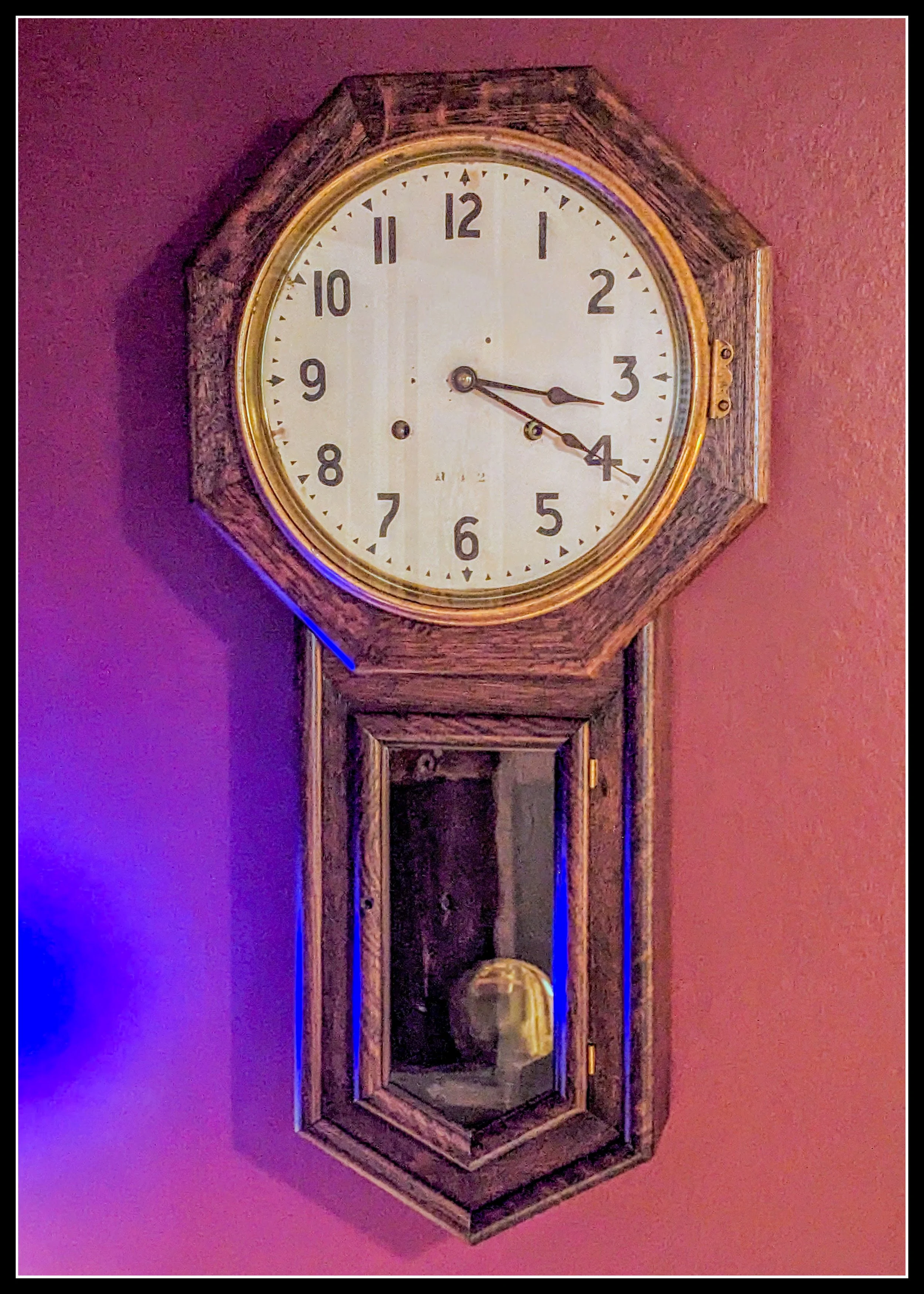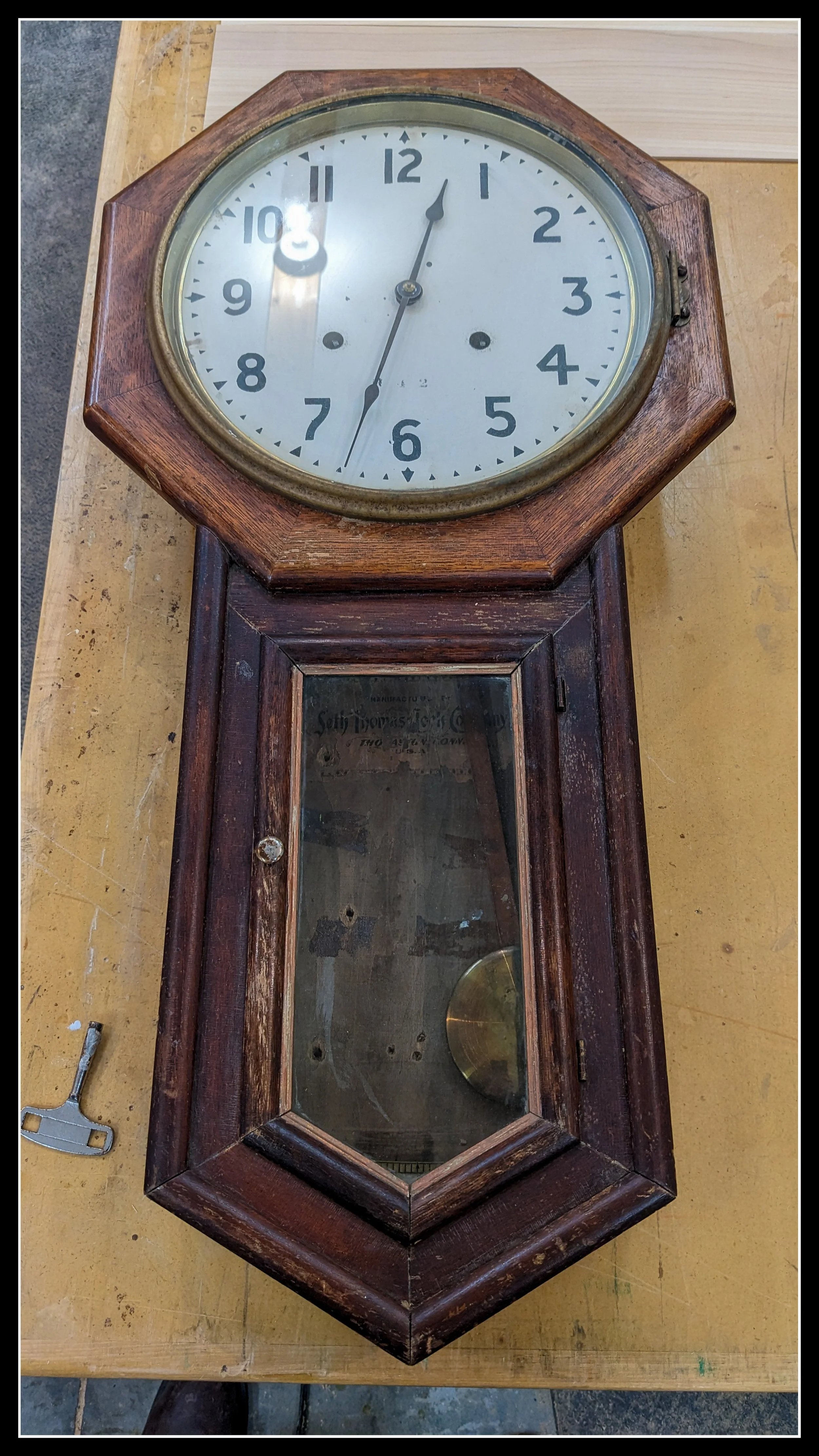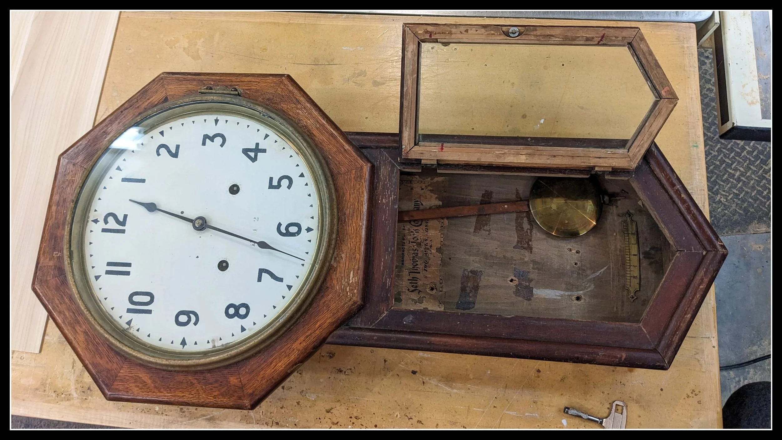 Before I close off here, I’d like to leave you with a thought. A few years ago, I was at the MCC thrift shop that sells furniture. I found a Seth Thomas long‑pendulum school clock built around 1895. I paid forty dollars for it. My dad, a retired watchmaker, repaired the movement and got it running. I repaired the oak case, and I sent it to Western Paint for stain, clear coat, and preservation of the interior decals.